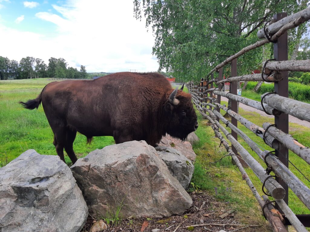I ett annat hägn står en enorm visenttjur orörlig nära staketet. Vi närmar oss försiktigt och vi skulle nog kunna sträcka in handen och klappa den men vill inte störa. Det är väldiga krafter som kan sättas i rörelse. En fullvuxen hanne kan väga upp mot tusen kilo. Vi pratar lite med den och beundrar den. Den står stilla, mäktig och outgrundlig.